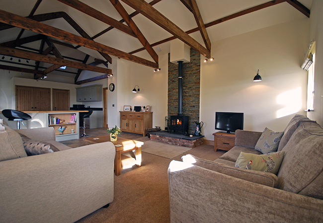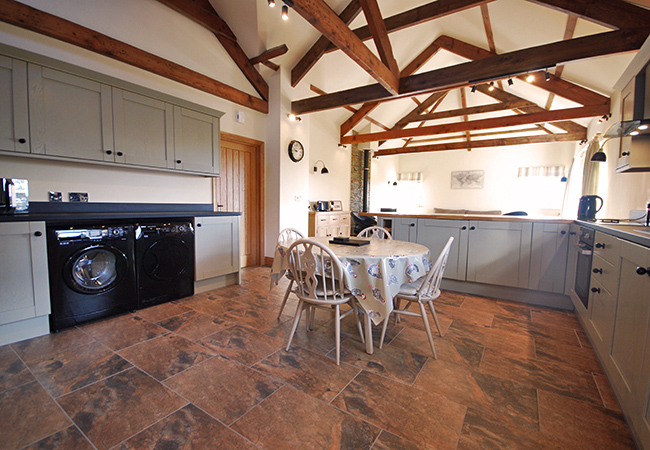 - Living Room / Kitchen: Large, open plan with TV/DVD, docking station, multi-fuel stove, electric oven, induction hob, microwave, fridge, freezer, dishwasher, washing machine, and tumble dryer.